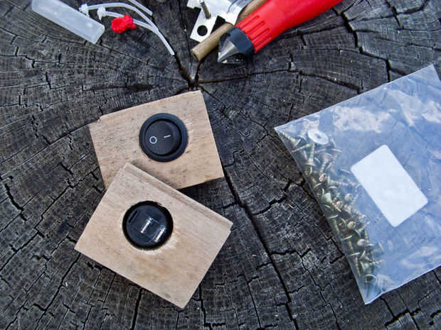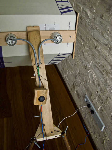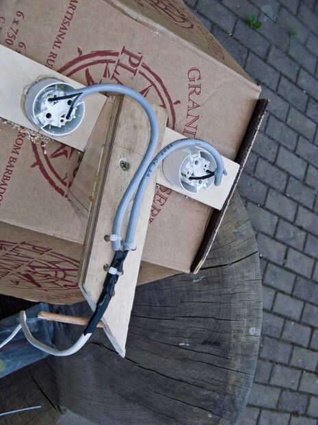 Puede que desee perforar unos agujeros incluyendo interruptores en algún lugar así que no tienes que dejarlas colgar en piezas separadas de madera como yo lo hice. Montaje de interruptores y el cableado es muy simple y no entraré en detalle aquí, puede ver el aspecto posterior de la lámpara en el cuadro 4.