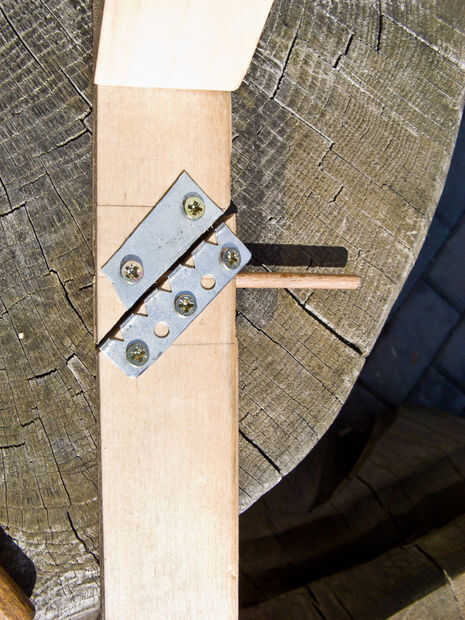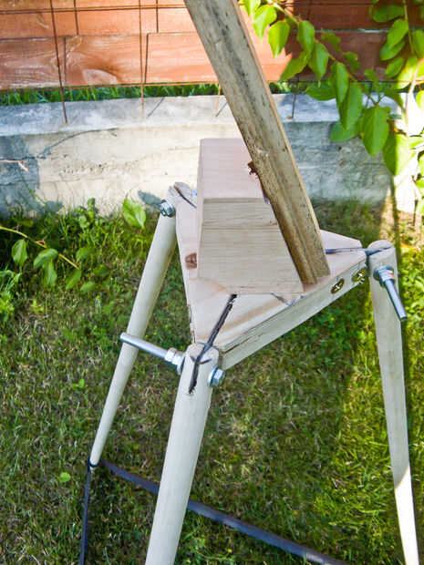 Tome un pedazo de madera (recomendamos madera sobre madera contrachapada de aquí) alrededor de 400 mm de largo y figura un lugar en ella donde quiere tomar un corte en un ángulo de 45 grados (lo hice alrededor de 2/3 del camino hacia el reflector). Después de marcar la diagonal corta línea de encontrar la mitad del mismo y perfore un agujero en la pieza de madera a lo largo de la línea donde agregará algo redondo - un tornillo o un palo de madera como yo lo hice. Hacer el corte y fije las placas de metal que como se muestra en la figura 2, están ahí para evitar el deslizamiento y deformación de la madera cuando se trata de ajustar la lámpara. Esta pieza de madera debe fijarse a los bloques de ángulo en el reflector y el trípode de forma que el metal placas punto hacia abajo (una breve idea de esa foto en 3).
