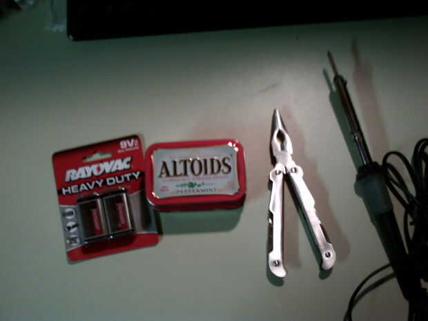 Caja de Altoids, interruptor de 12 voltios, herramienta multi, 2 tapas de conector de batería de 9 voltios y un sodering hierro y leds de 12 voltios de un automóvil (resistente al agua)