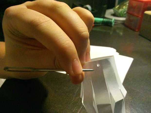 Punch 2 agujeros en los lados opuestos de la linterna con su aguja de coser. Los agujeros deben ser aproximadamente 1/8 de pulgada de la parte superior de la linterna.