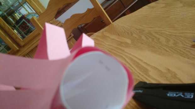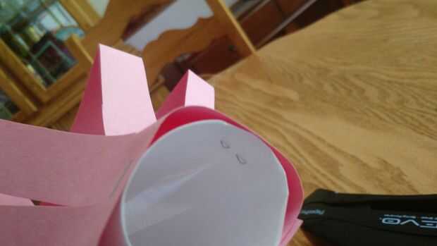 un pedazo de papel de impresora para (tratar de mantener el diámetro un poco menor y luego el exterior) y la cinta del rodillo. Entonces ponlo dentro y grapa la parte inferior cuatro veces. Presione la parte superior y añadir una tira de papel para montar como se muestra en la figura 4 (no engrape el lado opuesto de la tira que necesita)