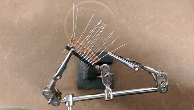 Puesto que ya no estamos ejecutando los LEDs en una fuente de alimentación de 3V compartido, necesitamos a ad una resistencia para cada uno para que no se queme. Corte un lado de cada lleva resistencias a unos 3mm de longitud y luego de la soldadura de cada uno el extremo corto de una fila de pines macho encabezado. Asegúrese de que no superar las clavijas con soldadura.
