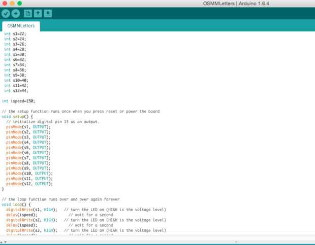 Conecte las cabeceras de tu cable de cinta a tu arduino con el conector de tierra va a una de sus tomas de tierra. Ahora programar tu Arduino a parpadear los patrones que gustaría ver. Empecé con el bosquejo básico de Blink de los ejemplos y hace una muy básica (y sé sucio) ejemplo. Esto sólo pretende ser un ejemplo de cómo empezar.