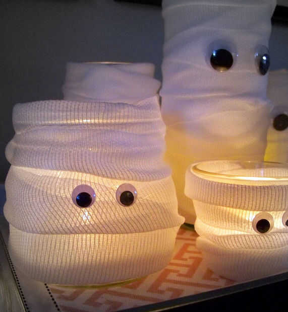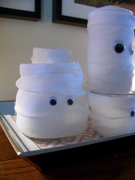 Todo lo que necesitas son tarros de mason o los recipientes de vidrio barato, gasa blanco y ojos saltones (disponibles en la tienda de artesanía). Comienzan en el botton del vidrio, y se adhieren a la gasa con cinta de doble cara o un punto de pegamento caliente. Luego Envuelva la gasa alrededor de la Copa, con suficiente solape para cubrir el vidrio bajo. Al llegar a la parte superior, se adhiere el extremo de la gasa con otro punto de pegamento o cinta. Luego pega un conjunto de ojos de mirada al frente.