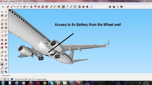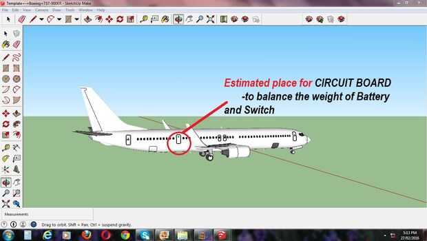 Tenga cuidado mientras que hacerlo en modelo de papel, como si el peso no se concentra en el centro el modelo de ser desequilibrada y no sería apropiado. Como en el modelo de 737 papel puse a pesado (batería) en el centro, menos pesada placa de circuito a la batería y el interruptor a más distancia de la batería en el otro lado. (Consulte la imágenes sketchup y el real)