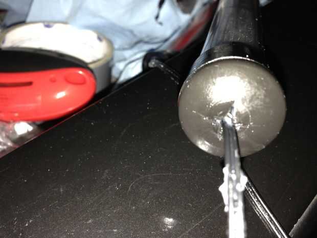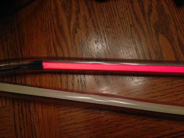 Cuando el epoxi cura completamente, el pasador y cinta pueden insertarse en el tubo de vinilo. Si tienes plexiglás tubo esto será fácil. El tubo de vinilo sin embargo quiere la bobina, así que primero inserte un extra 3/8 "x 36" pasador para sujetar la tubería recta. Tener a alguien ayudar a eliminar la espiga secundaria mientras la empuja en la espiga con la cinta EL. También pueden ayudar a mantener la tubería de flexión y atascamiento de la cinta.