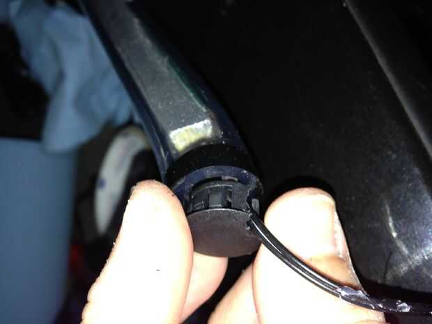 Hacer lo mismo en el extremo con los cables, pero primero corte una ranura en el enchufe para permitir que el alambre a través de. Luego cortar una X en el extremo de la clavija de muebles y fuerza con cuidado el conector del cable EL a través de él. Utilice silicona para asegurarse de que el tubo se sella (impermeable) en ambos lados.