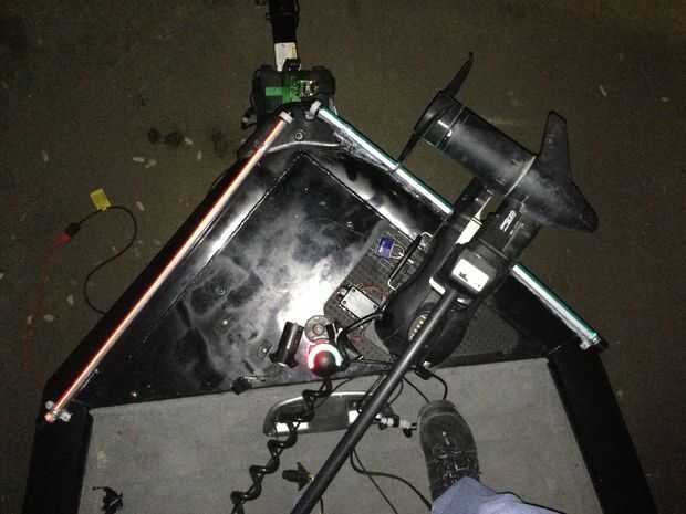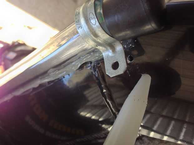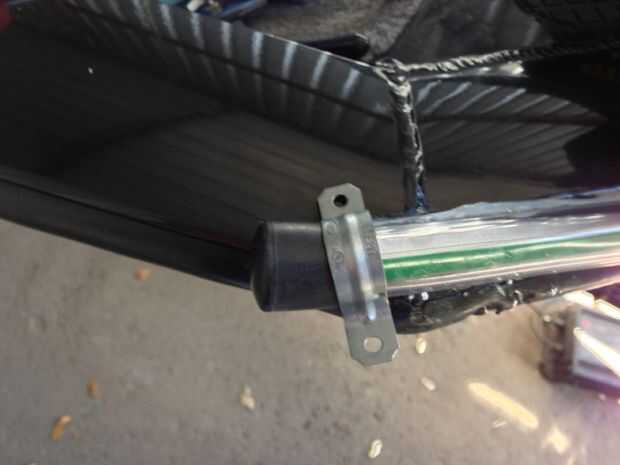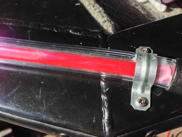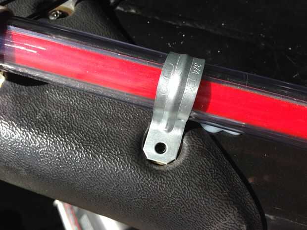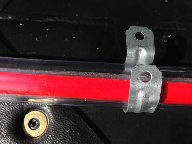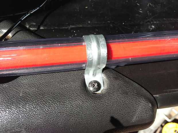 Luego usé el "Halex 3/4 en. Correas de tubo metálico eléctricas"para asegurar las barras de luz en ambos extremos. En la parte delantera he utilizado los orificios existentes en el "cono de la nariz." En el otro extremo, yo taladrar pequeños agujeros piloto y utilicé tornillos a través del cuerpo de aluminio.