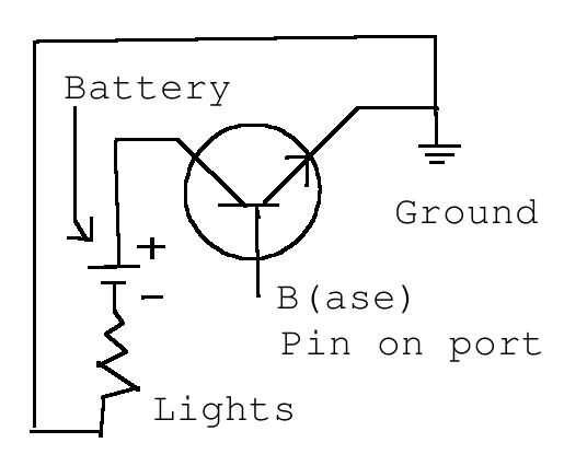 Tienes que cortar el cable en este lado de la batería para las luces. El lado positivo de la batería irá al pin del colector del transistor (ver c). El lado del emisor del transistor se irá al suelo (muestra e). El extremo suelto de la cadena ligera también se irá al suelo.