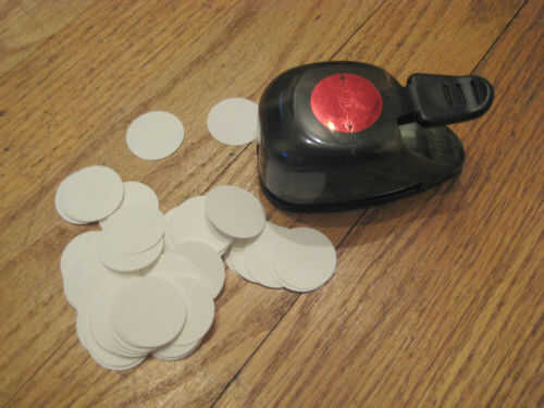 Golpear un trozo de papel para cada bulbo. Usé un círculo de 1 pulgada, pero obviamente puede hacer tus bombillas de cualquier forma y tamaño que desee y usted puede cortar en el lugar de perforación. Hacer letras para un cartel de lujo feliz cumpleaños, corazones para San Valentín, código morse de puntos y guiones, lo que quieras.