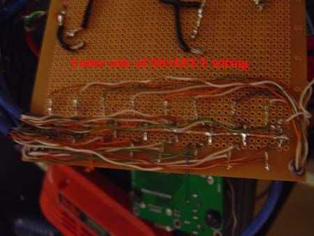 Aquí es la parte inferior de la Junta donde alambré los MOSFETS. Usé 3 pedazos de cable CAT5. Se puede ver el cable CAT5 azul a la izquierda y derecha. Esto mantiene un poco aseados y organizados.