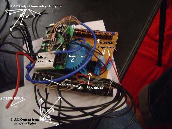 Aquí es una foto de todo el tablero construido. Pronto llegaremos a la tarjeta del microcontrolador. Pero, ahora usted puede pegar el transformador a la placa, gancho rectifire y condensadores y alambre los relés a los mosfets. Vas a tener 16 cables grandes para ir a las salidas de CA 110V, una entrada de 110V AC y un filamento de CAT5 para ir al microcontrolador.