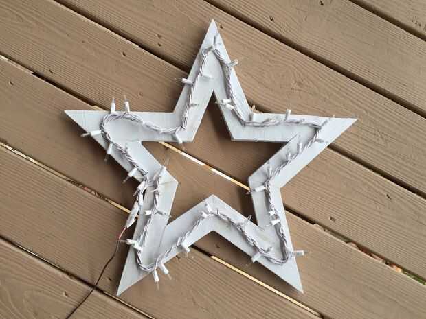 Las estrellas fueron modeladas después de los planes descritos en el pícaro Engin. La diferencia es que simplemente utilizar listones de madera contrachapada de 1/2 pulgada para mantenerlos ligeros. Yo también ampliar el diseño para hacer las estrellas cerca de 22 pulgadas a través. Usé cola de carpintero y una llave pequeña en la parte trasera de cada una de las 10 articulaciones para mantenerlas en su lugar.
