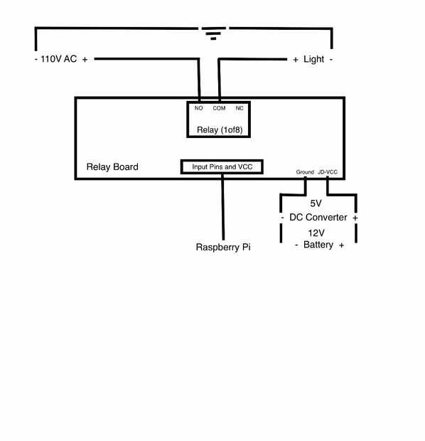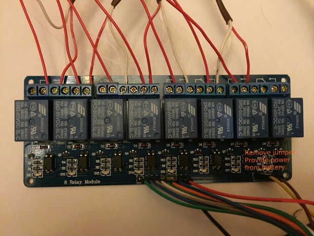 El módulo de relé de 8 canales se utiliza para proporcionar energía a cada uno de los 7 hilos de luces. Las luces utilizan 110 V CA por lo que es importante utilizar un relé aislado para proteger la frambuesa Pi desde el circuito de alto voltaje. La Junta utilicé tuvo opto-aisladores construidos cada relé en el tablero. 3.3 V de salida de la Raspberry Pi sólo es capaz de alimentar a algunos de los relés a la vez. Si has intentado activar los 8 al mismo tiempo, nada pasaría. Para solucionar esto, la energía es proporcionada en el módulo de relé por una batería de 12V se separa. Puesto que el módulo relé 5V, se utilizó un paso de DC conversor para convertir la señal de 12V a 5V. El + y - las salidas del convertidor están conectadas a los pines en la placa de relé en la esquina inferior derecha JD-VCC y tierra. Un buen recurso sobre el funcionamiento de la placa de relé se puede encontrar en: Arduino Tutorial de energía.