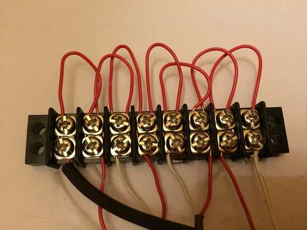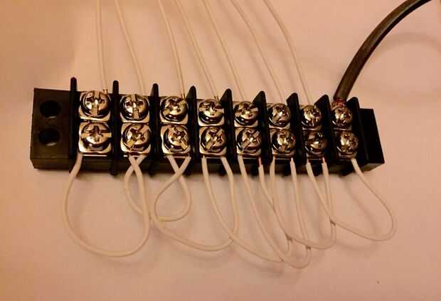El diagrama del circuito completo se muestra en el croquis adjunto. Un cable (+) de cada uno de los filamentos de luz 7 está conectado directamente a la terminal COM (común) de cada relé. La terminal (nominalmente abierto) NO de cada relé fue conectada a la corriente alterna de 110V de un bloque de terminales. El otro cable (-) de cada uno de los filamentos de luz 7 está conectado a tierra. Un cable de extensión de 110V AC fue conectado en el tomacorriente de pared y el otro extremo del cable de extensión fue corte y atado a un bloque de terminales positivo y negativo. El uso de los bloques de terminales hace un poco más fácil organizar los conjuntos de cables de 7 y una común + 110V AC y la tierra.