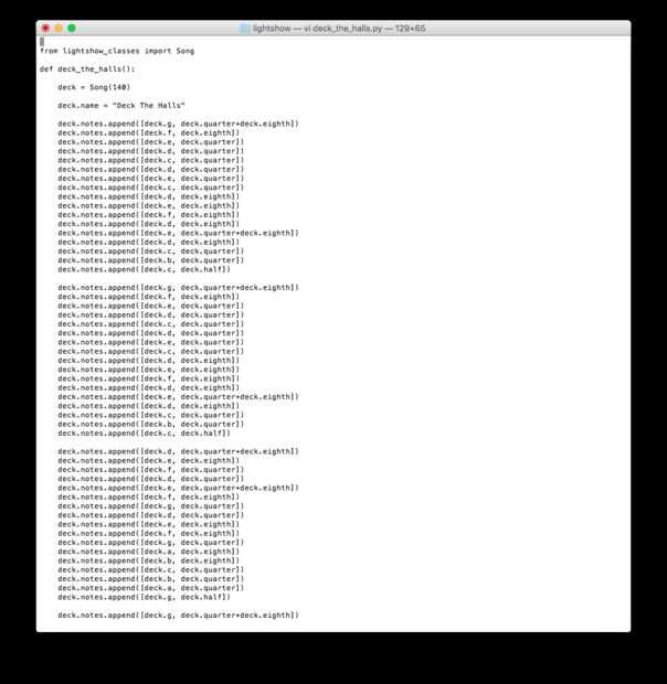 Cada canción tiene su propio archivo. Deck_The_Halls.py se utiliza como ejemplo. Estos archivos fueron creados por mirar un conjunto de música de la hoja y añadir a cada nota y su duración en la lista de Song.notes. Una parte importante de este archivo es el tempo en. Este es un argumento al constructor de la clase de canción (en el ejemplo es 140 latidos/minuto). Éstos fueron fijados por ensayo y error y usando lo que parecía ver mejor. En teoría, cualquier canción puede ser codificada de esta manera y agregó a la lista, aunque está limitado a sólo iluminar una luz en un momento.