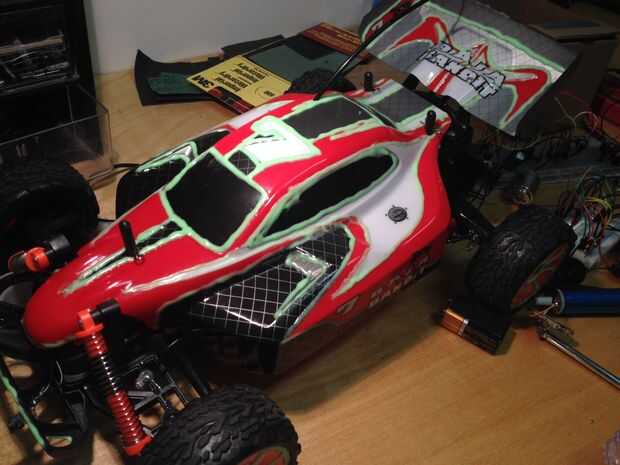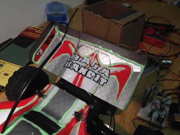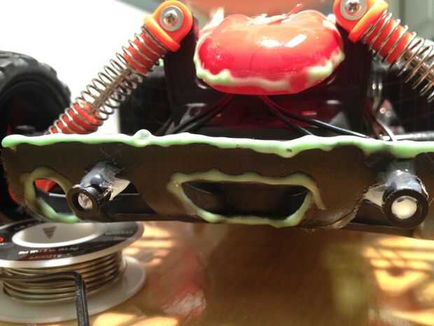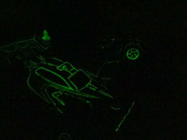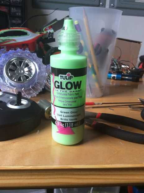 También puede crear un brillo super cool en el trabajo de pintura oscuro con brillo en la pintura de tela oscura. He usado resplandor de Tulip en el oscurezca pintura dimensional, que crea un efecto de textura demasiado. Básicamente, trazar todas las líneas importantes de la carrocería del coche, cargar con la luz y lejos del resplandor. Sin embargo, es sobre todo para las miradas cuando el neón no es ya que los LEDs eclipsar el resplandor. Yo también localizar los pliegues en mi transmisor, que añade otro efecto genial y hace visible en la oscuridad. Ver mi Instructable completo esta aquí.