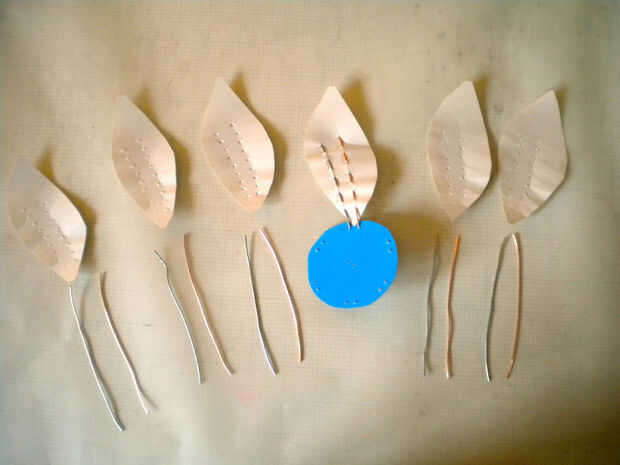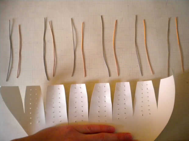 Poke filas de 8 agujeros en cada segmento y cortar 6 trozos de alambre de aluminio y cobre, aproximadamente de 4 pulgadas de largo. Enrosque el alambre por los agujeros, asegúrese de alternar el tipo de alambre. En este ejemplo he utilizado 18 calibrador de cables de cobre y aluminio, pero puede utilizar zinc en lugar de aluminio.