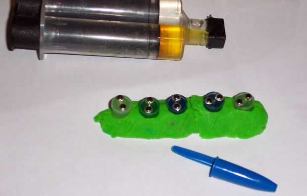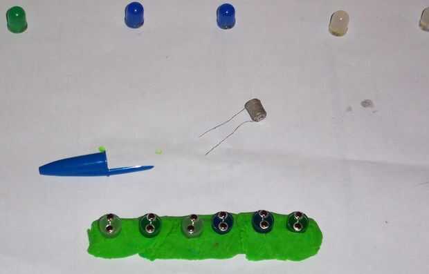 Usted puede probar el LED antes de que el epoxi haya endurecido completamente con una batería de 3V a pequeños hilos - simplemente toque los cables a los imanes para ver los LEDs encienden. Tratar ambas formas porque el LED se iluminará solamente si el poder está conectado en la polaridad correcta.