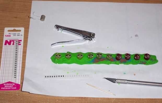 Coloque un pequeño trozo de cinta de doble cara al final de la hoja. Esto hará fácil recoger y colocar las resistencias pequeñas.