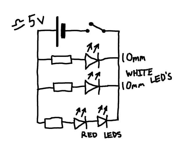 Cargador del teléfono proporciona aproximadamente 5v pero cuando el LED de corriente encontré la tensión disminuida un poco. Para obtener la corriente correcta a través de las resistencias de Ohm 12 tres LEDs, funcionó bien para mí. Valores de resistencia entre 12 y 20 ohmios es probable que sea conveniente si usted está usando 0.5W LED blancos, pero vale la pena comprobar las corrientes con un polímetro si puedes.