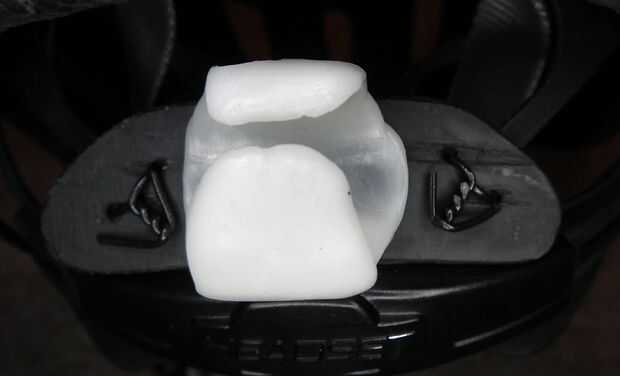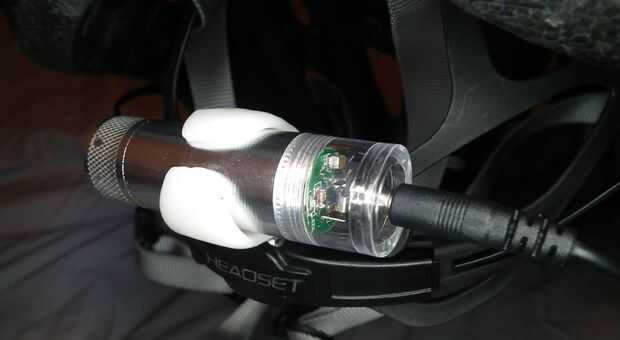El soporte fue atado al casco por atarla en con pequeños pedacitos de alambre envuelto alrededor de la correa para el cuello de plástico en la parte trasera del casco.