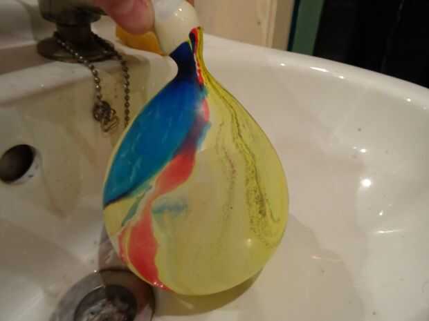 Si lo desea que puede agregar unas gotas de alimento colorante en el globo antes de llenarlo con agua.