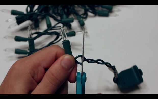 En primer lugar, cortar los cables después de la última bombilla (aproximadamente 1/2" distancia) para quitar la extensión. Entonces, si las luces de Navidad tiene un cable que no está conectado a la bombilla pasada, empiezan a desentrañarlo. Este cable debe ir todo el camino de regreso a la primera bombilla de luz. Al llegar al final de la misma, corte cerca de la primera bombilla.
