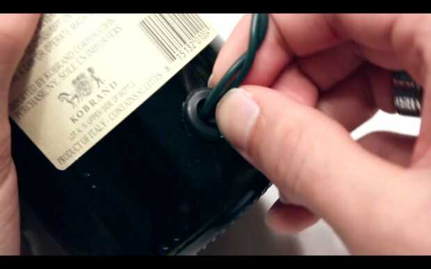 Estamos casi listos! El último paso es hacer un ojal en el orificio para asegurarse de que el vidrio no cortan los cables. En primer lugar, sus tijeras y un radio corte en el ojal. Luego tomar el ojal y empuje en el agujero. Dependiendo del grosor de la botella, esto puede tomar algún tiempo. Sea paciente y trate de usar un lápiz o bolígrafo para forzar el ojal por el orificio.