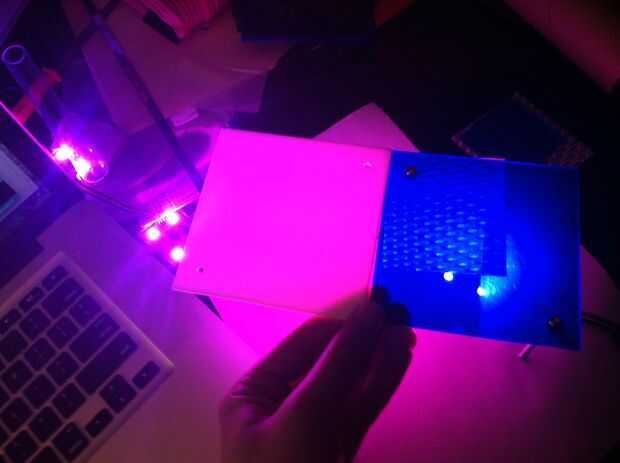 Tenía una tira larga de módulo cuadrado direccionable LEDs WS2801, así conseguí unos diferentes colores de acrílico cuadrados en distintas opacidades para probar cómo vería con los LEDs detrás de ellos. Algunos colores de la luz se veía mejores que otros, por lo que he observado que cuando llegó la hora de programar los LEDs, engancharía a tonos de azul y blanco en su mayoría. Ordené los colores mirando de acrílico de Tap Plastics, precortado a cuadrados de 4 x 4", que terminó costando un dólar por pieza. También compré varios pies de dos tipos diferentes de material de difusión, poner detrás de las plazas claro.