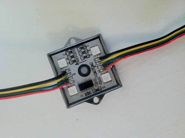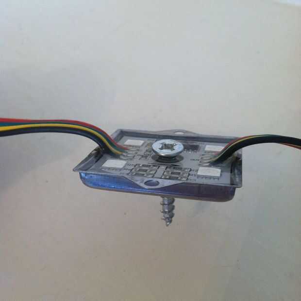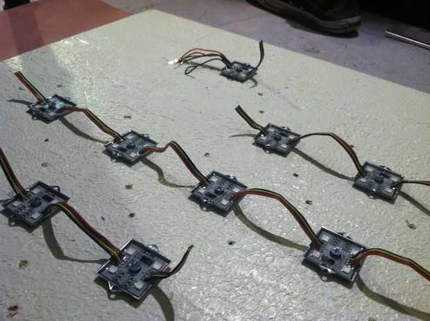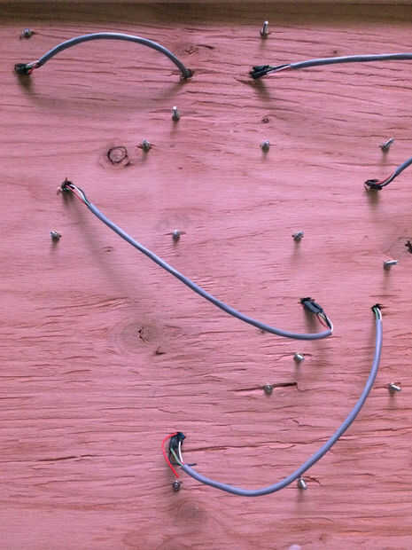 He medido y ligeramente dibujó una cuadrícula en mis grupos de apoyo y siguiendo mi diseño, marcada donde los LEDs necesitan para ir. Los LEDs tienen convenientemente un agujero para un tornillo en el medio, así que atornillan simplemente les en el tablero con unos 3/4" tornillos para madera, serpenteando las filas hacia adelante y hacia atrás. Los cables debían cortarse en un montón de lugares, pero para los píxeles que serían justo al lado del otro, los cables de conexión eran una longitud perfecta. Para los LEDs que cables tenía que cortar, perforar los agujeros para pasar los alambres de conexión a través de y los soldados juntos en la parte posterior. Con una plaza de plantilla, también marcado y había perforado de agujeros para los tornillos que cada pixel acrílico.