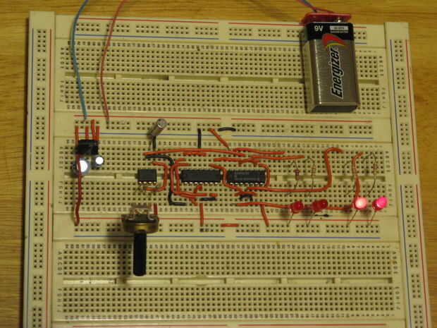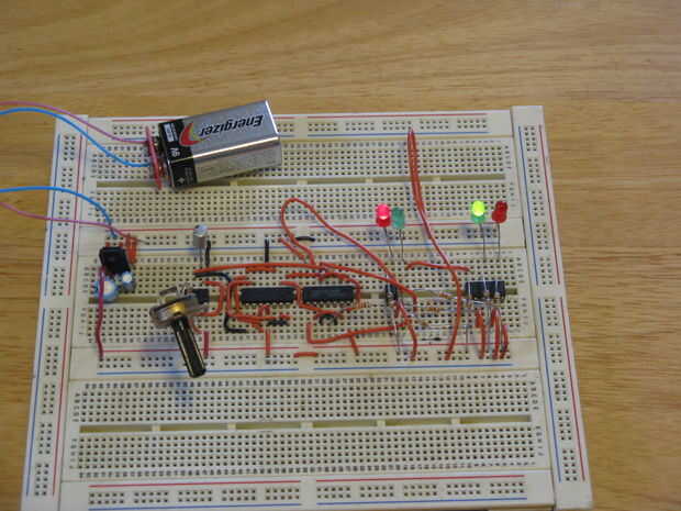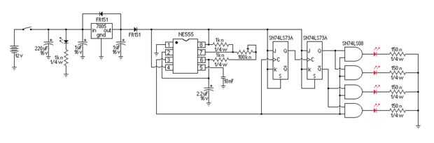Enviar el pulso de reloj 555 temporizador para el primer JK Flip Flop y un lado de cuatro de los dos de entrada y puertas. Desde el primer JK Flip Flop conectar el Q para el segundo reloj de chanclas. Desde el segundo Flip Flop conectar Q a dos de la segunda entrada de y puertas y Q a los otros dos y puertas segunda entrada. Conecte el conjunto de los Flip Flops JK a la potencia de 5 voltios ahora al conectar los LEDs hasta las puertas y la misma manera que en el intermitente derecho de izquierda, flash a la derecha, derecha, izquierda, izquierda y la espalda.