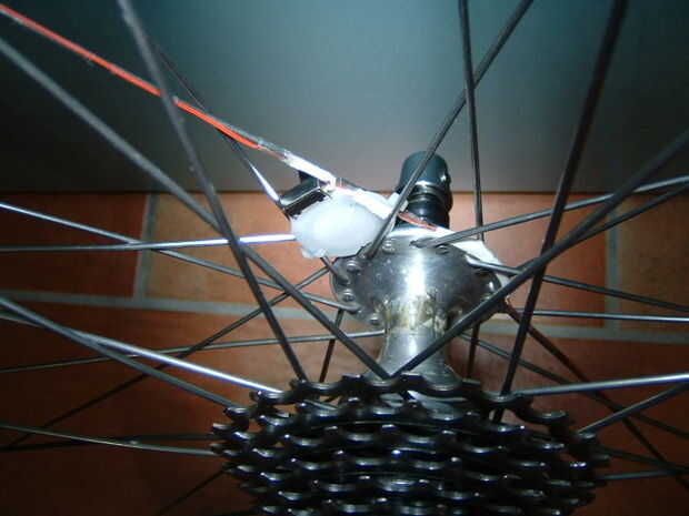 Luego enrolle juntos los cables correspondientes a los polos de la batería, cada cruce para darle más fuerza, aísle con cinta y vincular a los rayos para evitar cualquier desgarramiento de la soldadura. Algunos cinta puede utilizarse para fijar los cables en el borde de la brida de cubo.