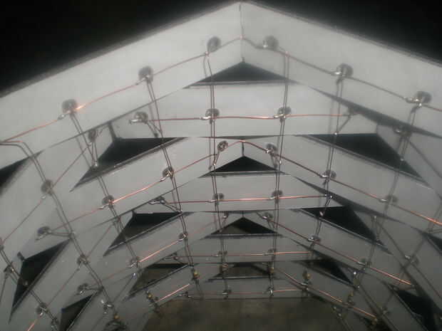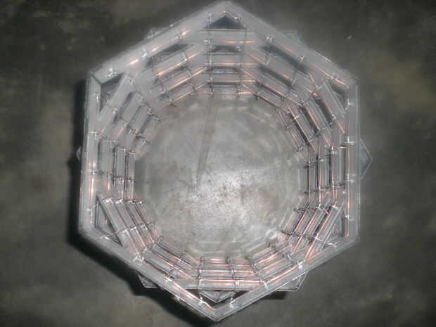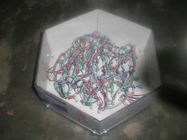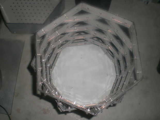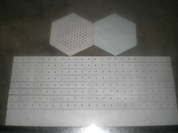 Construido para un telón de fondo de etapa este proyecto cuenta con algunas formas hexagonales de 3/4" la pipa de PEX, similar a un aro del LED hula, algunos 12 voltios RGB LED tira y un NLED 30 canal alto LED controlador de corriente. Los hexágonos