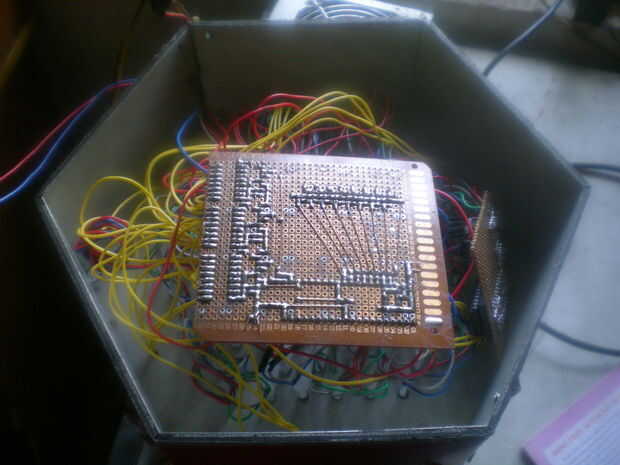 Construido para un telón de fondo de etapa este proyecto cuenta con algunas formas hexagonales de 3/4" la pipa de PEX, similar a un aro del LED hula, algunos 12 voltios RGB LED tira y un NLED 30 canal alto LED controlador de corriente. Los hexágonos