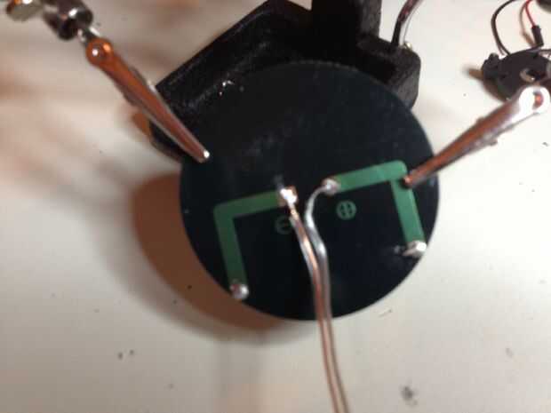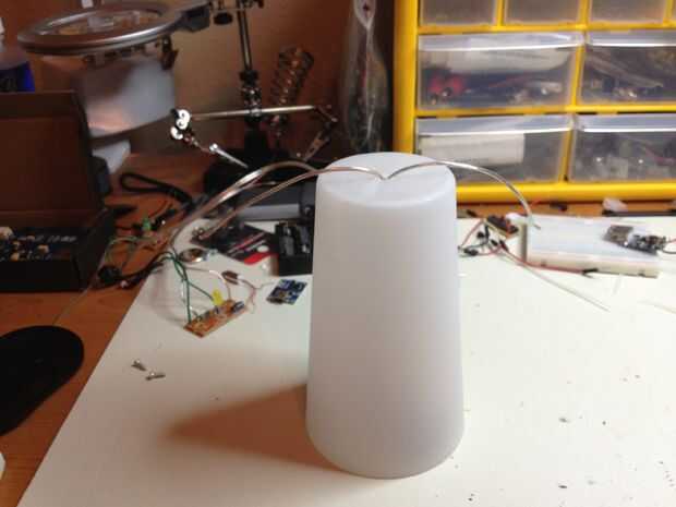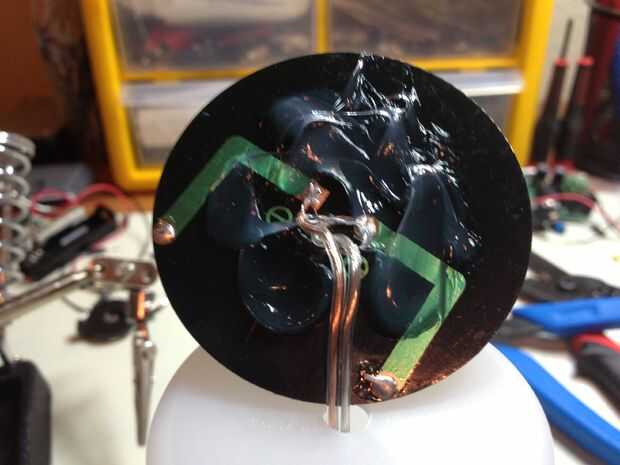 perforé un orificio de 1/4" en la parte inferior de la taza de plástico para los cables de la célula solar pase a través. Entonces, impulsó los cables del altavoz la parte inferior de la Copa y soldado en la célula solar. He dejado suficiente cable para permitir el soporte de la batería colgando pero no toque la superficie de en que la taza estará sentado. Os adjunto la célula solar en la parte inferior de la Copa con sellador de silicona.