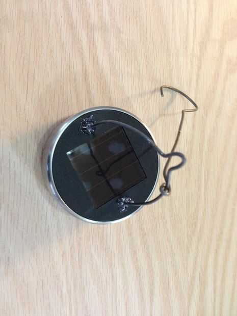 Usar una broca de 1/16 (o más grande si la suspensión del alambre es más grueso) para hacer agujeros a cada lado del panel solar. Luego formar el gancho de alambre y presionar a través de los agujeros. Doblar los pies pequeños en la parte posterior y luego pegarlos caliente. Añadir un poco de pegamento caliente a la parte superior para evitar que el agua se introduce dentro de su módulo solar.
