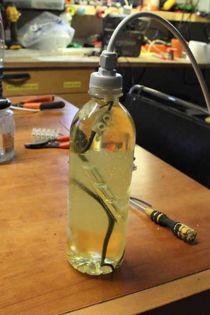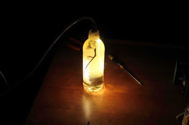 Recalentado de un tubo de 1000 W en una botella de 1000 mL. Probablemente necesita una botella de 1,5 L para tener suficiente circulación y enfriamiento dentro del aceite.
