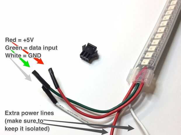 Mayoría de las tiras de WS2812 viene con tres conectores. He quitado la carcasa de plástico del conector y conectar los cables a los pines directamente (encajan bien). Blanco es GND, rojo es + 5V y verde es la entrada de datos.