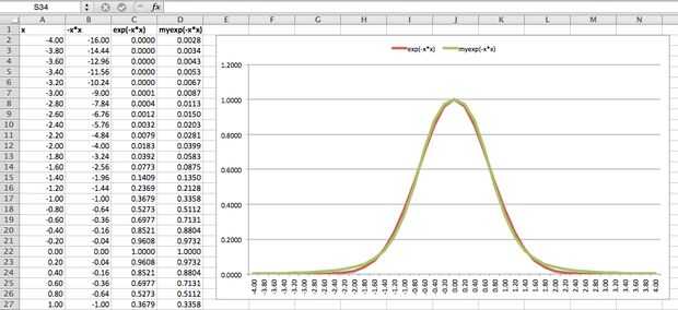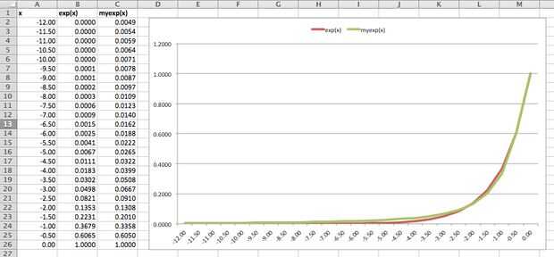 La función exponente en Arduino biblioteca parece ser muy lento, así que hice una aproximación utilizando sólo dos multiplicaciones y una división: 1.0/(1.0-(0.634-1.344*x)*x). Tenga en cuenta que esta aproximación es conveniente solamente para x < 0.