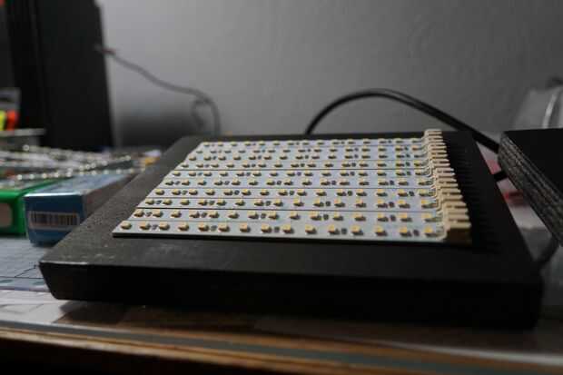Perforé dos agujeros de 1/16 pulgadas en la parte superior izquierda de mi tablero, uno para cada uno de los rieles de voltaje. Originalmente iba a encadenar todos lo LED tiras juntas, pero me pareció que trabajar con tales hilos pequeño tratar de soldar dos cables a cada terminal una pesadilla.
