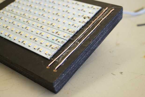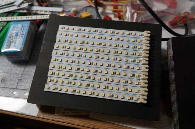 Hice un diseño rugoso y dibujó una línea antes de empezar a pegar por lo que tendría una marca de referencia cuando se encole las luces hacia abajo. Una cosa a la nota en este paso es que cada una de las tiras de mi media era de direccional: puesto que solían ser parte de una tira más grande, algunos tenían el carril positivo por un lado y algunos en el otro. Si tuviera que hacerlo otra vez, hago que ponen hacia fuera en un patrón como este: