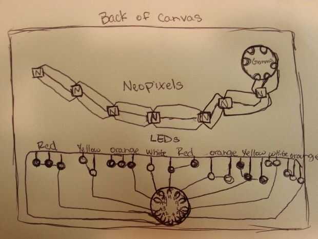 Esta es una imagen del esquema para los LEDs y neopixels que será cosido en la parte posterior del lienzo.