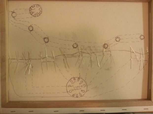 Esto muestra el diagrama de las luces dibujado la parte posterior del lienzo, con las patas del LED penetra a través de. (Nota: la Gemma debe ser en el otro lado de la línea de neopixels.)