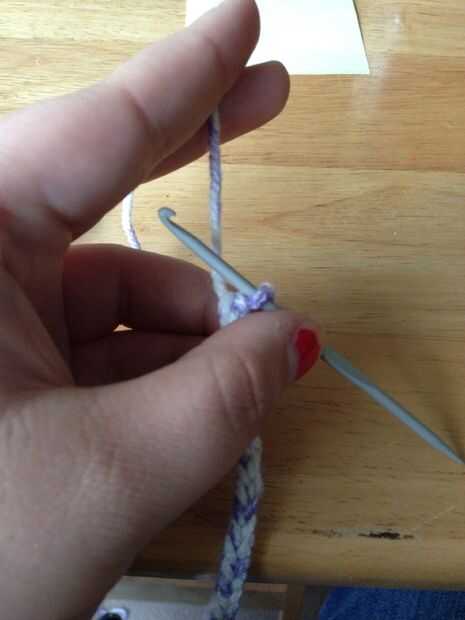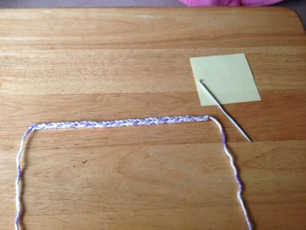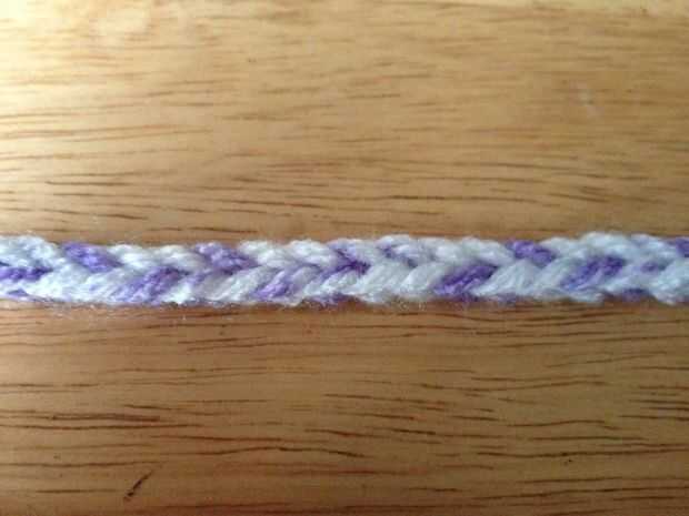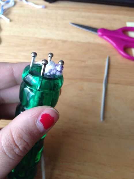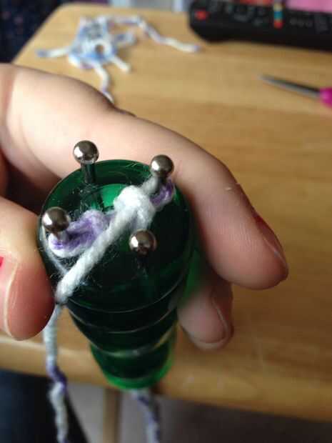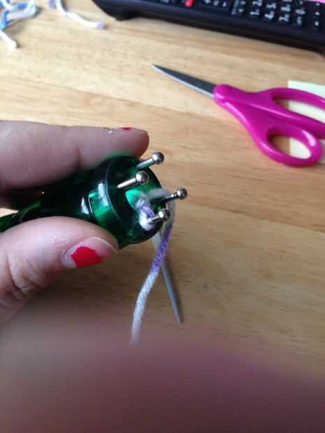 Sólo Levante el último lazo que se formó (i tirar de su hilo de trabajo va a ser el lazo que tirones un poco) y ponerlo en la otra clavija. Tirar el hilo de trabajo un poco por lo que permanece en su lugar, y luego levante el bucle inferior sobre y suéltelo. Cortar el hilo de calcetero de 6 pulgadas. Usando su elevador (mina tiene un pequeño ganchillo gancho en un extremo, pero es fácil con una aguja de punto o incluso los dedos si eres suave) tirar el extremo del hilo a través del lazo pasado y dar un tirón para asegurarlo.