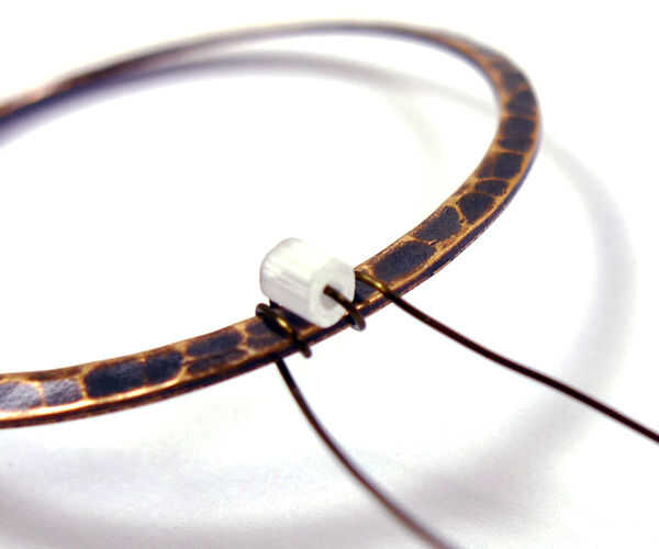 Alimentar un grano de semilla en una longitud de alambre de cobre para que el grano de semilla es en medio del cable. Enrolle el cable alrededor de un anillo martillado para que el grano de la semilla se encuentra sobre la superficie del anillo. Envuelva el cable una vez alrededor de cada lado del grano de semilla, tirando el cable firmemente. Alimente el alambre a través del extremo de una sección de 2 pulgadas de cadena y envolver el alambre alrededor del anillo. Añadir un grano de semilla al alambre y envolver una vez. Repetir, añadiendo cada sección de la cadena en este orden; 2 pulgadas, 1.75 pulgadas, 1 pulgada, 1.5 pulgadas, 1,25 pulgadas. Envuelva una tira de semillas entre cada sección de la cadena.