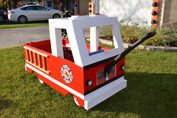 Sabíamos que no queremos pintar, uñas, pegamento o dañar el wagon Radio Flyer original de ninguna manera. Así que mi marido construyó una estructura alrededor de la carreta con 2 "x 2" madera listones. Entonces usa 2 hojas de aislamiento rígido para construir todo el exterior del camión de bomberos y había clavado en la estructura de madera. Para cubrir las etiquetas impresas aislamiento rígido, tomó 3 capas de pintura roja o blanca. La parte frontal del camión de lo bomberos cuenta con linternas como faros. La parrilla del carro se corta de armario estantería de alambre. Los topes se hicieron con base de madera adorno de Home Depot con capas de espuma detrás de él para hacerlo más grueso. También nos pega en alguna cinta negra para darle algún detalle extra. En los lados de los camiones de bomberos, construimos escaleras poco fuera poco juego "madera de los cabritos" de espuma. Imprimí un departamento de bomberos etiqueta y etiqueta de "Tener espalda" y laminado a adherirse a la lado/parte posterior del camión de lo bomberos. Las luces traseras se hacen de reflectores circulares. También compramos una cinta reflectante negra y amarilla para colocar en la parte trasera del camión de lo bomberos. El camión de bomberos superior luces funcionan luces reflectantes bicicleta que centelleo similar a un camión de bomberos real. Así que por la noche, las luces rojas y luces de trabajo que se vea más real.