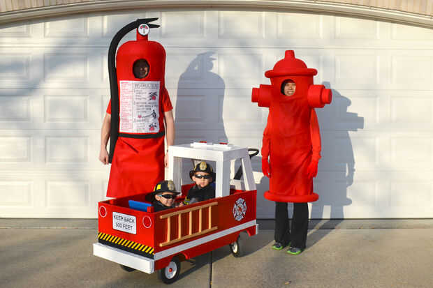 Después de oír hablar de historias del 9/11, nuestros hijos aprendieron lo que eran héroes. Ellos inspiraron realmente a ser héroes y salvar vidas. Les encanta visitar abiertas de la estación de bomberos, ver programas como Chicago Fire y los eventos de bomberos verdadero viene al rescate en las noticias diarias de aprendizaje. No fue ninguna sorpresa cuando decidieron que querían ser bomberos para Halloween. Con un niño de 2 años y 5 años de edad, Halloween es agotador en sus piernitas. Decidimos convertir nuestra wagon Radio Flyer en un camión de bomberos para que puedan sentarse convenientemente en cuando estaban desgastadas de ir puerta a puerta. Va con el tema "fuego", mamá y papá decidieron ser un hidrante y extintor de incendios.