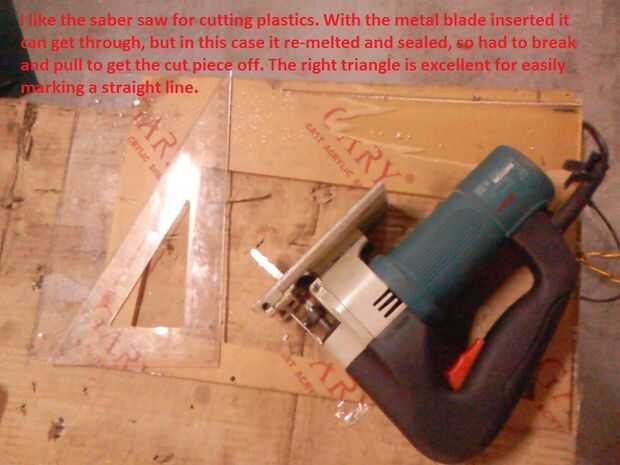 Cortar una tira larga de acrílico descartó el hack vio porque el hack vio portacuchillas conseguiría de la manera después de unas cuantas pulgadas. La Sierra de sable es rápida y con una cuchilla de metal parece que funciona. Sin embargo, esto era engañoso porque después del corte el acrílico caliente fusionados sí mismo atrás, así que tuve que cortar dos veces y aparte tire rápidamente antes de otra vez.