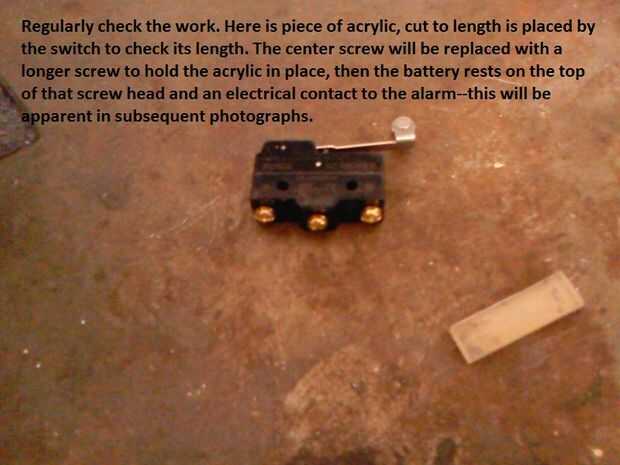 Aquí la tira de plástico se corta a longitud hasta el tamaño aproximado para albergar la batería y uno de los tornillos de montaje de la alarma.